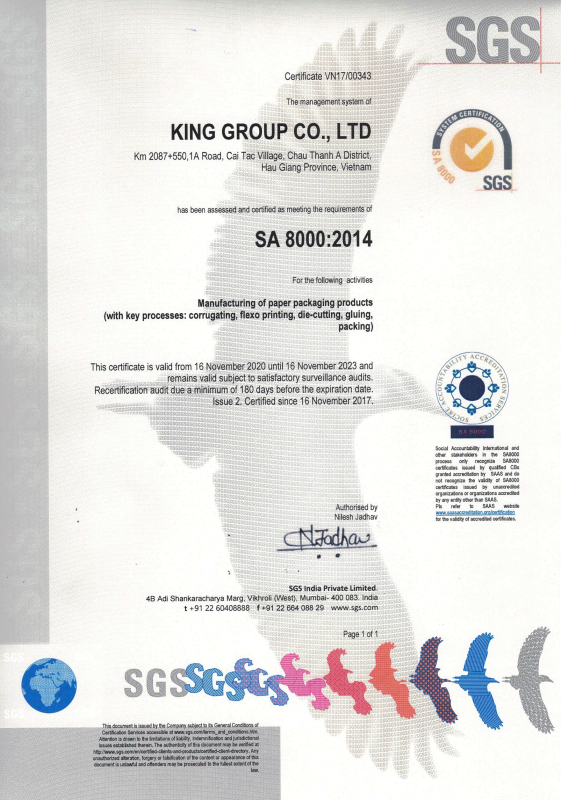 Nhà máy bao bì carton King Group được thiết kế và sản xuất đạt tiêu chuẩn an toàn vệ sinh cho thực phẩm và các hàng tiêu dùng khác của Việt Nam và Quốc tế. Công ty đã đầu tư nhân lực và thiết bị cho phòng kiểm nghiệm chất lượng và nguyên liệu sản phẩm theo tiêu chuẩn quốc tế.